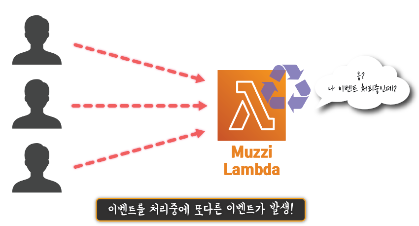 람다는 먼저 들어온 이벤트를 처리하고 있겠죠? 근데 또다른 이벤트가 무찌람다에 요청을 하게되니까 람다는 이걸 동기처리하든, 비동기처리하든 해야한답니다.